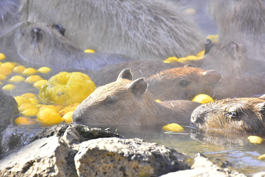 イベント期間中、平日は13時30分からの1日1回、土曜・日曜・祝日と冬休みおよび春休みの期間には、10時30分からと13時30分からの1日2回、カピバラたちが露天風呂に入ります。