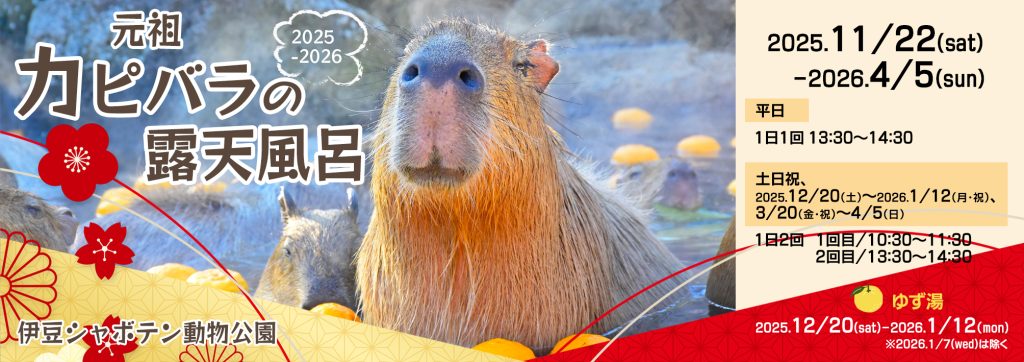 伊豆シャボテン動物公園では、2025年11月22日(土)より2026年4月5日(日)まで、「元祖カピバラの露天風呂」を開催いたします。