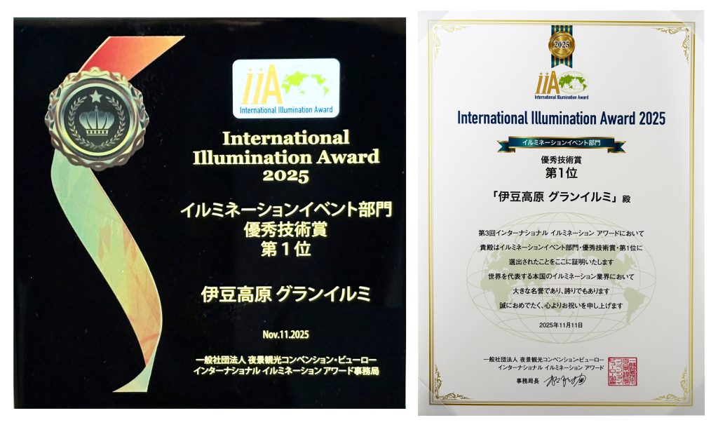 伊豆ぐらんぱる公園「伊豆高原グランイルミ」は2025年11月11日(火)、一般社団法人夜景観光コンベンション・ビューロー(東京都:丸々もとお代表理事)、ぴあ株式会社が主催する「International Illumination Award 2025」において、「イルミネーションイベント部門」優秀技術賞にて第1位を受賞いたしました。