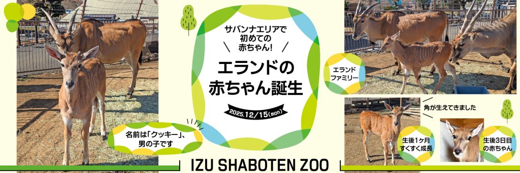 伊豆シャボテン動物公園では、2025年12月15日(月)に、ウシ科の大型草食動物・エランドのオス「ビスケット」とメス「メープル」の間に1頭のオスの赤ちゃんが誕生いたしました。