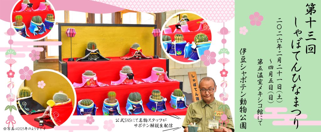 また展示期間中には当園公式SNSにて、世にも珍しい「しゃぼてんひなまつり」を祝い、長年植物を担当する名物スタッフによるサボテン解説生配信を行います。ぜひ、この機会に奥深いサボテンの世界にご注目下さい。